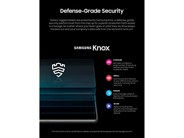 - DEFENSE-GRADE SECURITY — Samsung Knox protects sensitive data right out of the box and enables you to customize settings to fit the needs of your business. NOTE: A subscription to Samsung Knox features can be purchased directly from Samsung Knox