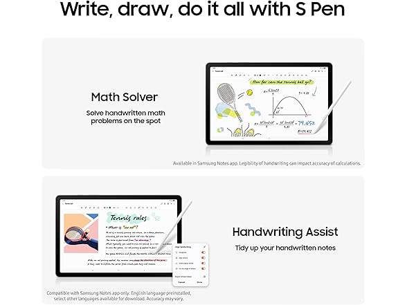 - WRITE, DRAW, DO IT ALL: S Pen is mightier than your average writing tool. The responsive design and intuitive integration with intelligent features make drawing, jotting down notes and even doing math easier than ever