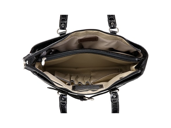 Main compartment features an interior zipper pocket and an interior organizer for pens, business cards and small devices. Main compartment also features a padded laptop section that fits and protects most laptops up to 15.4” in screen size. Main compartment also features a key chain holder. Secure, centered zipper pocket within the main compartment. Front and side pocket for small miscellaneous items. Comfortable, leather shoulder straps.