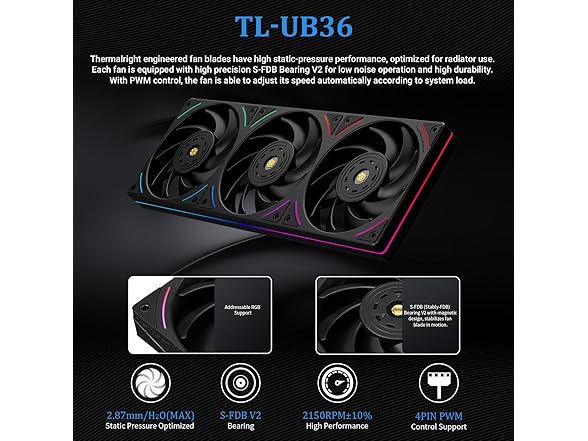 - [Fan Parameters] TL-UB36W, fan size 360x120x25mm, speed: 2150RPM±10%, noise≤27DBA, interface: 4pin PWM, air pressure: 2.87mmH2O (MAX), air volume: 69CFM (MAX), S-FDB V2 bearing can solve the problem of fan blade vibration in lifting mode, with PWM function, can automatically adjust the speed according to CPU temperature