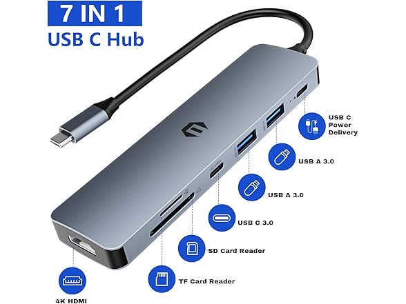 - 【7 in 1 USB C Docking Station】:USB C Hub works perfectly with the type C laptop devices with the multi-port USB-C adapter, including: 1 x USB Type-C charging port, 1 x 4K HDMI, 3 x USB 3.0 A ports, 1 x SD/Micro SD card reader.