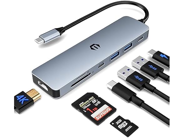 Tiergrade USB C Hub Multiport Adapter is built in 7-in-1 USB Type C Hub, including HDMI, 100W PD Charging Port, 3 x USB 3.0, USB C 3.0 and SD/TF card reader. This USB C docking station supports pass-through charging, which means you can charge your laptop while connecting other devices at the same time. It is compatible with Chromebook Pixel, Dell XPS 13/15, HP Spectre x360, Lenovo Yoga 920/910/720/901 and more. Please note that the HDMI port does not support video output.