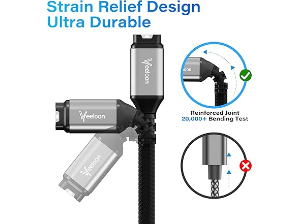 【Strain Relief Design】The Strain Relief Design is a technique used in the manufacturing of cables to reduce the stress and strain encountered during use, preventing damage caused by excessive bending or twisting. The design has passed over 20,000 bend tests in the laboratory.